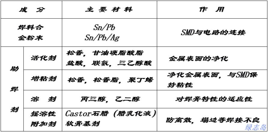 焊錫膏成份及作用表: