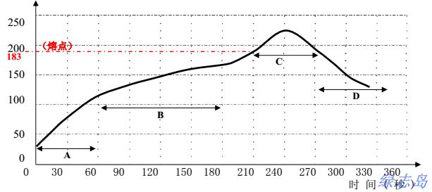 ? 上述溫度曲線是指焊點處的實際溫度,而非回焊爐的設(shè)定加熱溫度(不同)